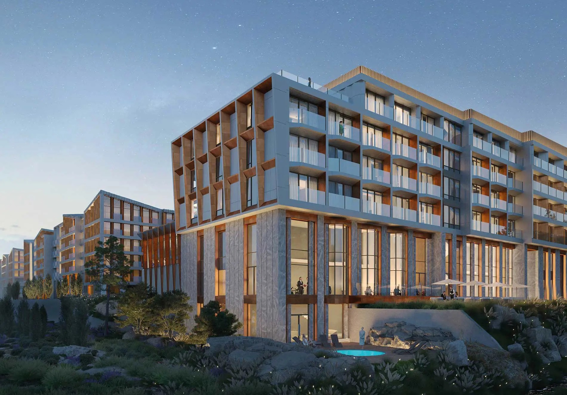 - это новый 4* отель, находится в самом центре курортного комплекса "Лунная Поляна" на территории одноименного поселка всесезонного курорта в "Архыз". Проект на 6 этажей и 215 номеров разработан международным архитектурным бюро Blank Architects.